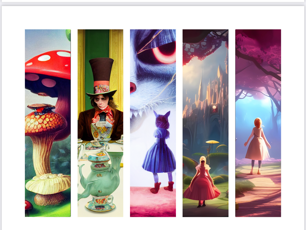 You will receive 5 pages of 5 Alice in Wonderland bookmarks per page made with images created by Artificial Intelligence.